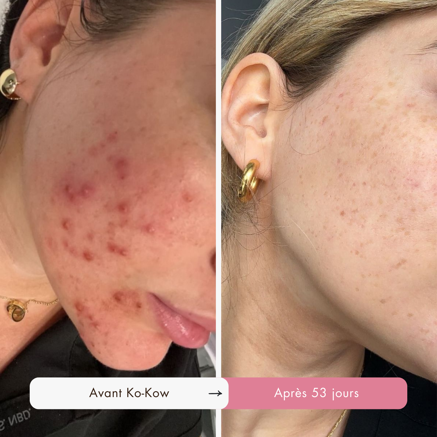L’acide kojique aide à réduire l’hyperpigmentation résiduelle après les boutons, tandis que le curcuma possède des propriétés anti-inflammatoires et antioxydantes qui calment les marques rouges et améliorent l’éclat global.