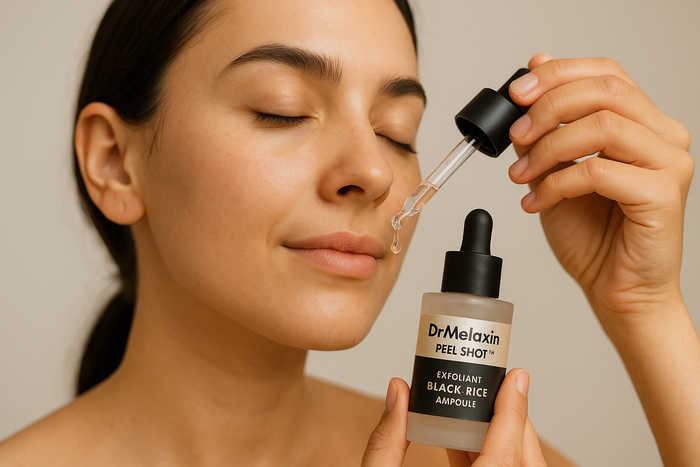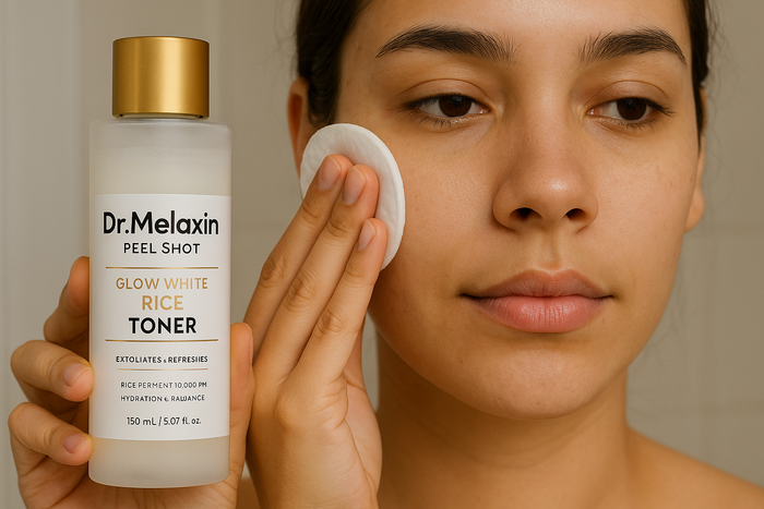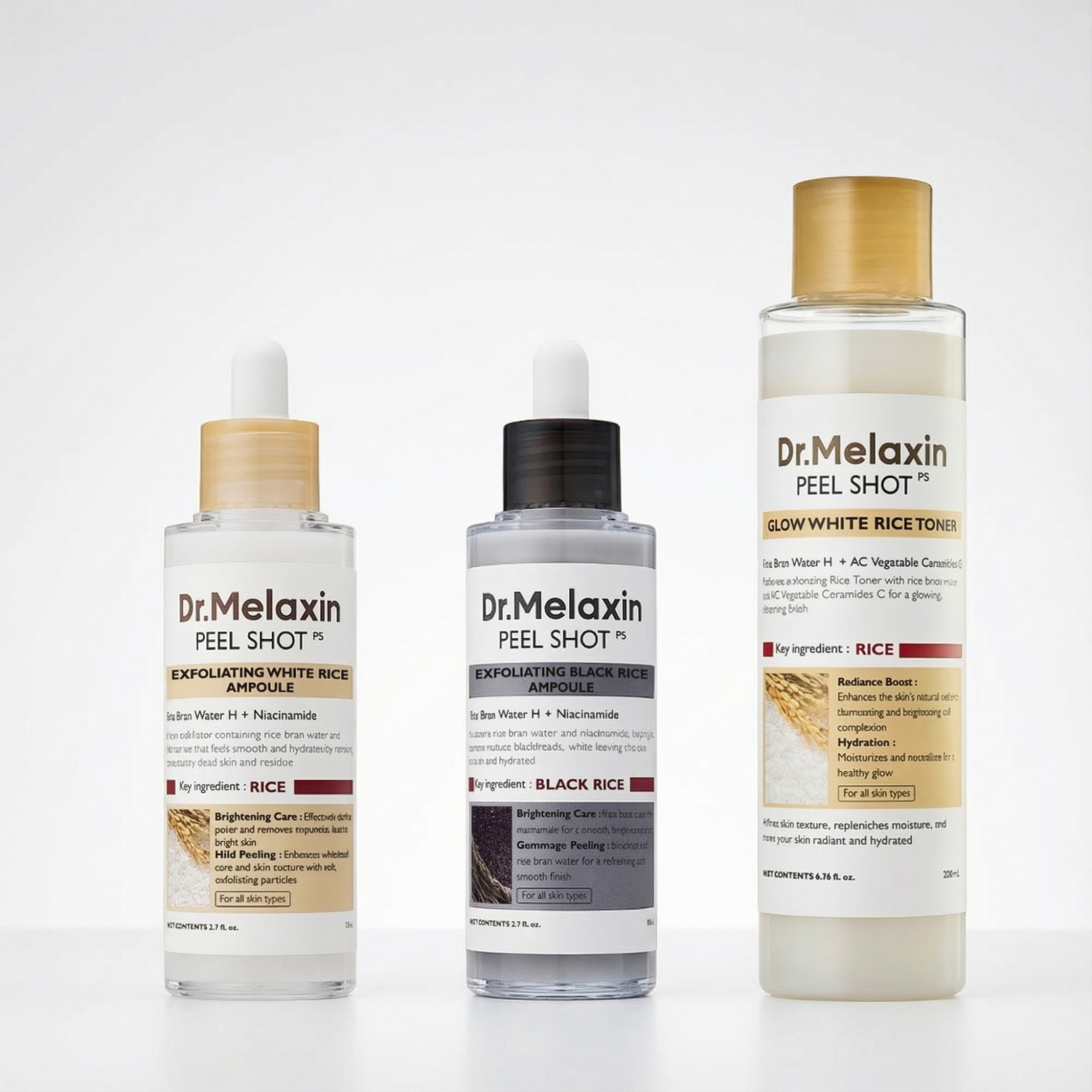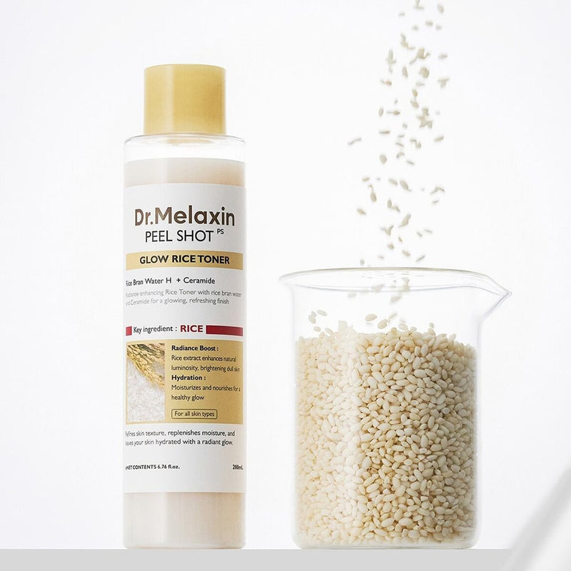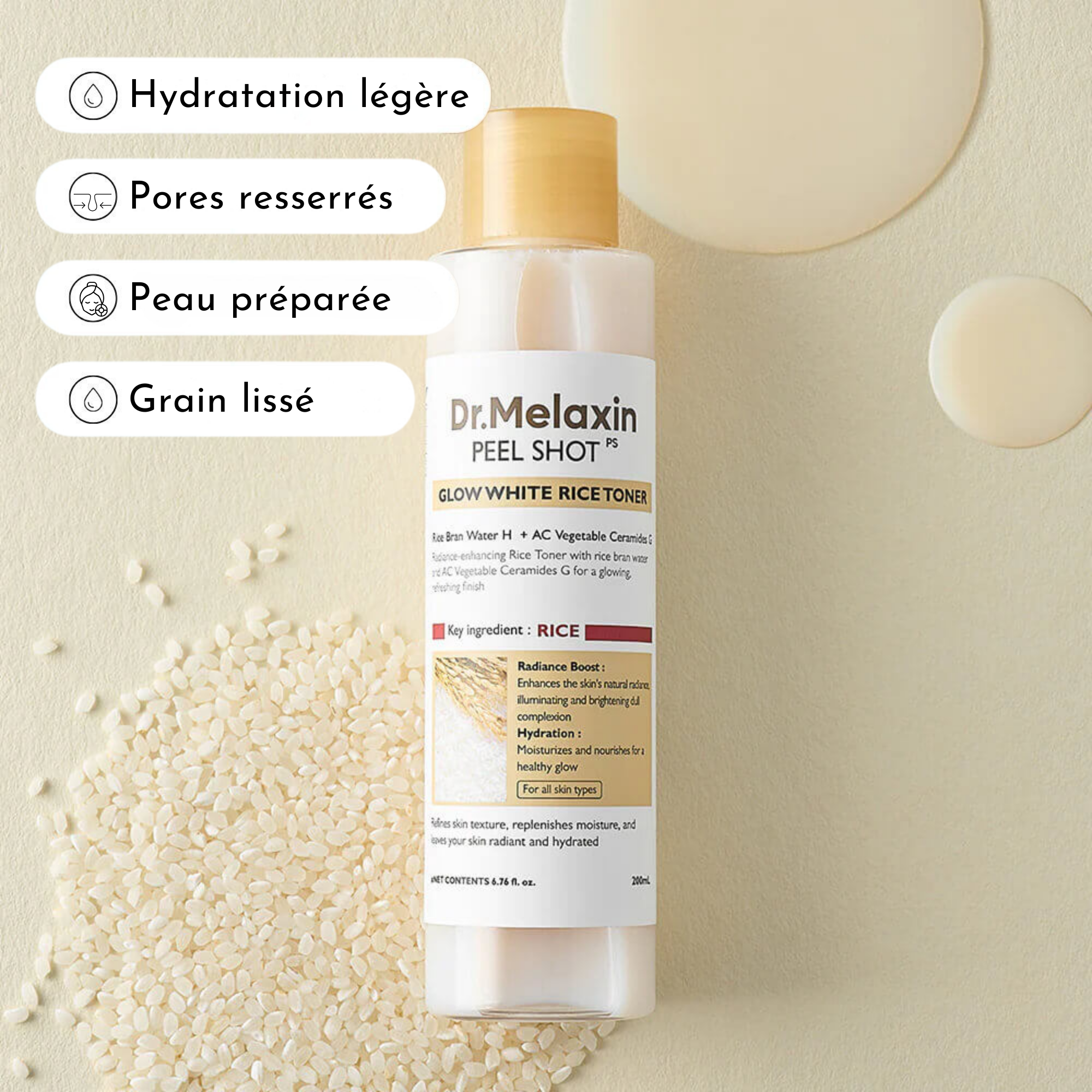Après le nettoyage : 1) Glow White Rice Toner (cotton ou mains), 2) Rice Peel Ampoule sur la zone T/pores, 3) Black Rice Ampoule pour lisser et unifier, puis hydratant. Le matin, ajoute un SPF 50.