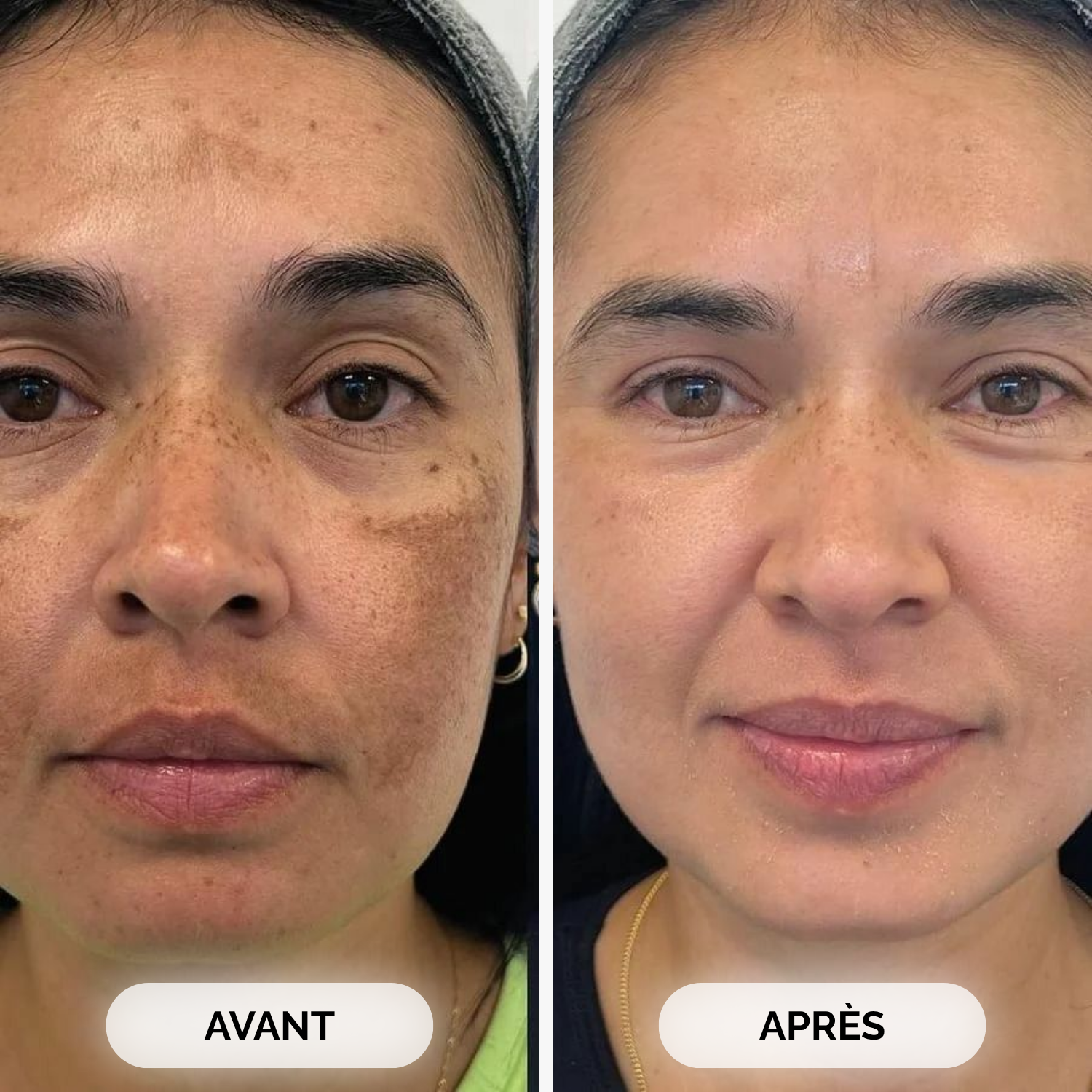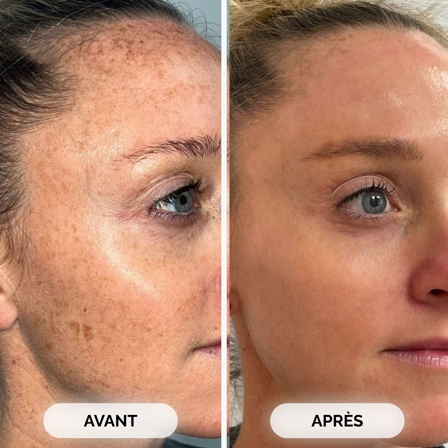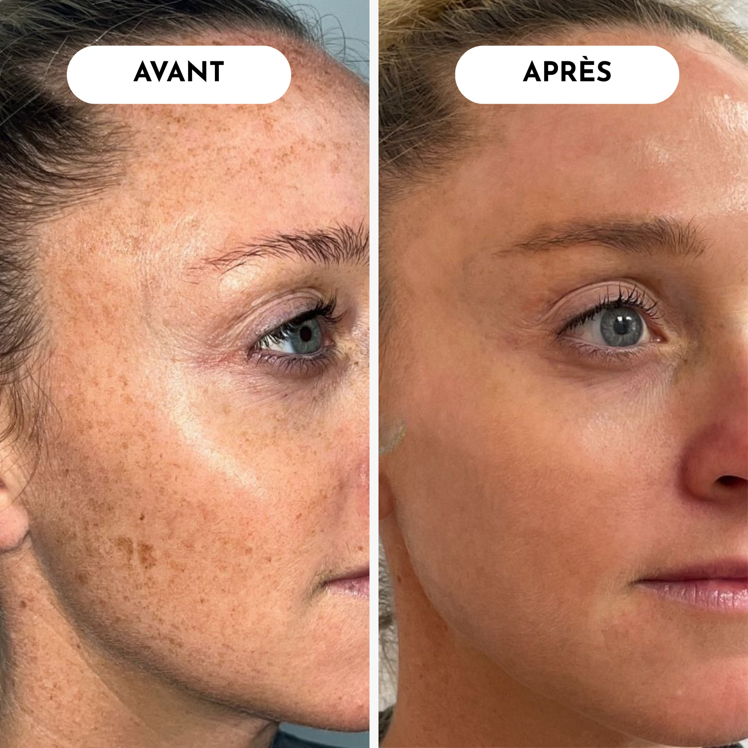 Alterne Jaune / Noir selon les jours et termine toujours par le Toner. En quelques jours, grain affiné, points noirs qui s’effacent et éclat durable.